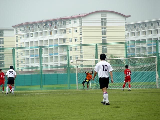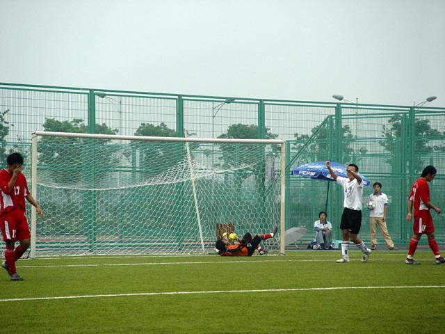 上半场20分钟,我方左后卫4号梁昊助攻到前场,一脚远射直奔球网右上死角,首开纪录。