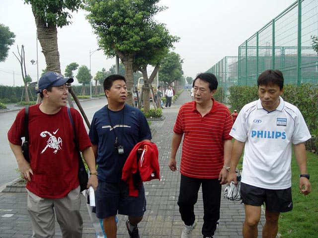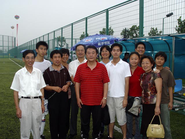 我队7号球员李爽(左二)的亲友团到现场加油助威并与总教练金志扬合影留念。
