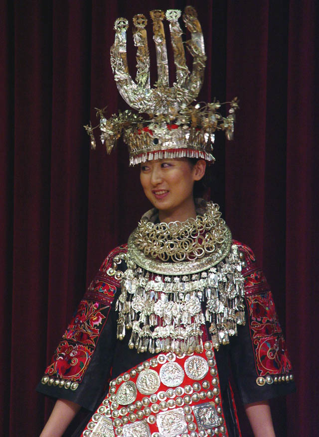 苗族姑娘从5、6岁开始向母亲学习蜡染和绣花,当一套盛装秀成之日,即是苗族姑娘出嫁之时。苗族服饰的特点是银的装饰,一套婚礼服所有银器可重达七公斤以上。