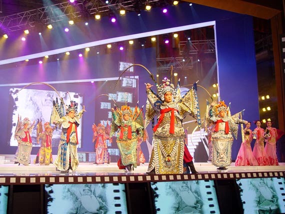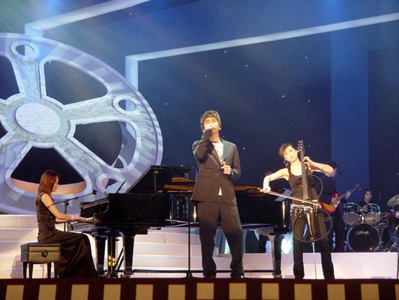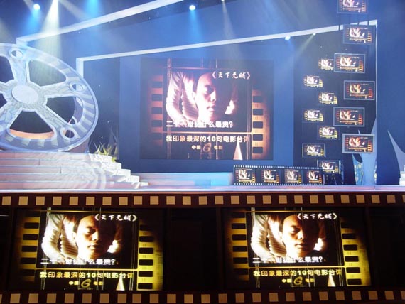 值得一提的是,此次晚会的舞台设计极具视觉特色。整个舞台被近60个等离子显示屏包装成电影的“片格”造型,使观众仿佛置身于一座梦的工厂。