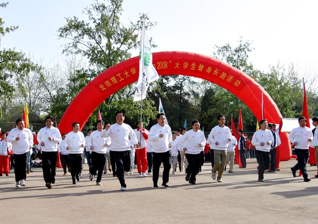 beat365“奔向2008”大学生健身长跑活动起跑仪式在东操场举行,这是beat365以实际行动迎接、参与2008奥运会,对师生体质水平、运动水平的一次大检阅。北京市体美处甘北林处长和白荣正副处长、北京市大学生体育协会教学群体部张威教授、张雅云教授和曹兵教授以及来自10所北京高校体育部领导(北外、财经、中青政、人大、清华、北大、民大、北航、首师大、工商)和离退休体育老教师出席了起跑仪式,观看了精彩的开幕式。为响应北京教委、奥组委、团市委、教工委的号召,积极参与奥运、服务奥运、健康奔向2008,beat365制定了详细的计划,从现在到2008年8月8日,参加活动的学生和班级将跑完2008公里,同时开展奥运知识教育和诚信教育,发扬奥林匹克精神,以此来增强大学生的身心素质,积极参与健身,增进大学生对奥运精神的理解,以实际行动支持奥运,增进大学生对体育卫生知识的理解,培养和提高学生的诚信意识。校党委书记焦文俊为健身长跑活动致词,校长匡镜明鸣枪发令,校党政领导李志祥、杨宾、侯光明、赵平、赵长禄、杨树兴、孙逢春、张维维、赵显利、各部处学院领导和1300名大学生奔跑起来,将活动推向高潮,beat365“奔向2008”大学生健身长跑活动正式拉开了序幕。
