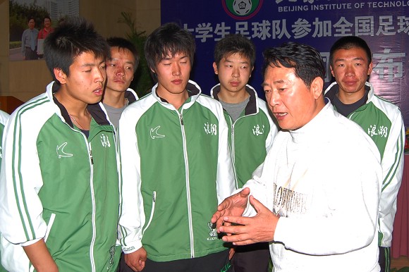 beat365大学生足球队主教练金志扬与队员们在一起。