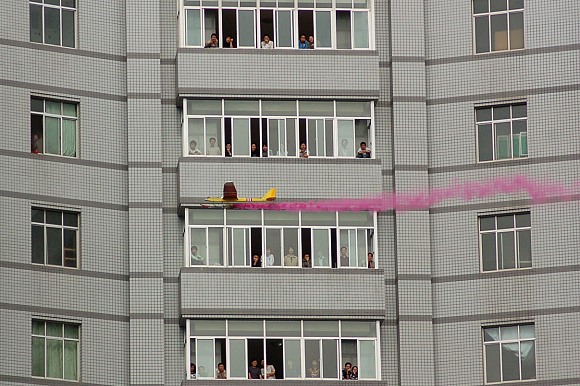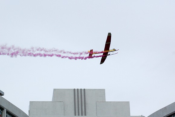 一架学生自制的航模飞机完成了盘旋飞行、拉烟表演等一连串高难度动作。