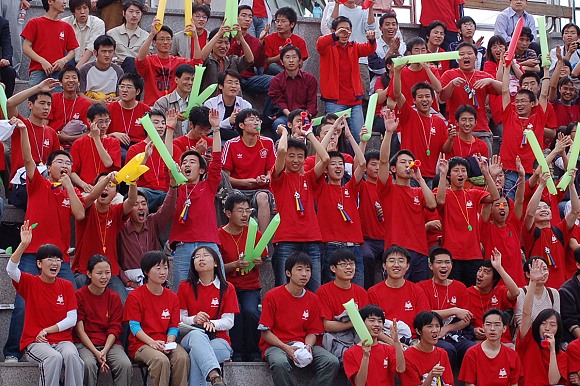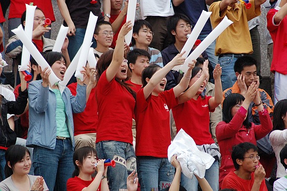 机电工程学院分团委组织了1200余名同学,身着统一的红色T恤衫,手持喇叭、口哨、活力棒等助威“道具”,来到现场为自己的球队加油助威。