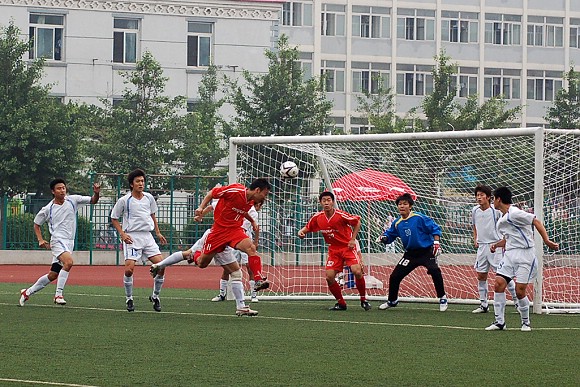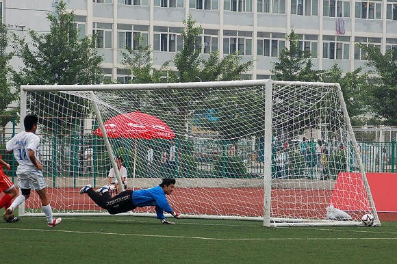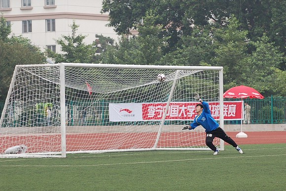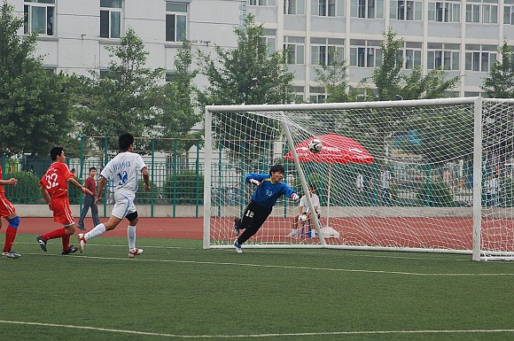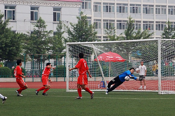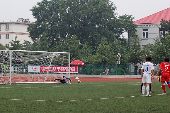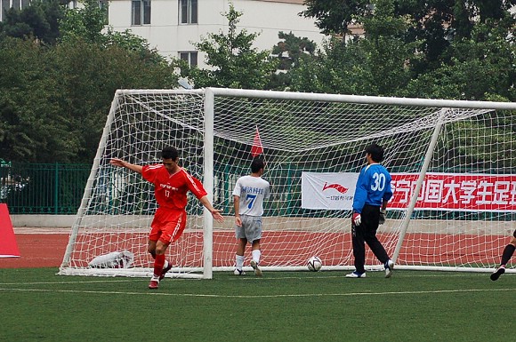 过于猛烈的进攻并没有敲开对方的大门,由于全部队员过于压上,反而使同济大学足球队在第10分钟的一次防守反击中获得了点球的机会。beat365足球队守门员18号王毅飞身救球,这次角度非常之刁的点球竟然被王毅挡出门外从而化险为夷,这给了全体队员们极大的鼓励,大家在加强防守的基础上继续向对方大门猛攻。