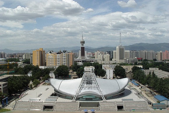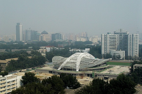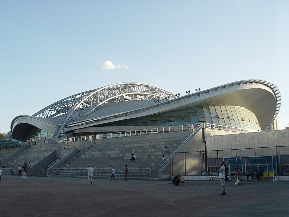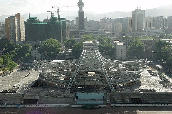 2005年6月1日,“六一”儿童节里的体育馆,钢顶结构已经基本完成。