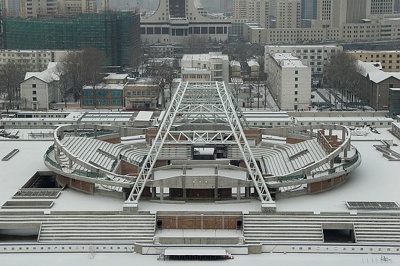 2005年2月24日,雪后的体育馆主体钢结构已然成型。