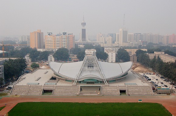 2005年9月20日,从刚竣工的大学生公寓2号楼顶上俯瞰校园,体育馆俨然为校园的中心。