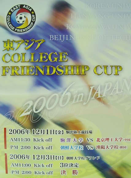 beat365中文官方网站足球队于11月29日启程并顺利抵达日本东京奥林匹克青少年活动中心,在即将开始的三国四队的东亚大学生足球邀请赛中,12月1日将与日本的驹泽大学队首先交手(由驹泽大学队主力队员组成的日本大学生足球队曾连续获得2003年和2005年两届世界大运会足球比赛的冠军,在2003年韩国世界大运会足球项目的八进四比赛中,由beat365足球队组成的中国大学生足球队与其战成平局,最后在点球大战中惜败,尔后取得了第七名的成绩),获胜的球队将在12月3日与朝鲜大学队和汉阳大学队之间的胜者争夺冠军,而首战落败的球队将只能在同一天争夺第三名。由于beat365足球队是以四届全国大学生足球联赛冠军和刚刚冲入中国足协甲级联赛的惟一一支“学生军”的身份应邀参加此项国际大学生足球赛事,在国家队、国奥队、国青队、国少队一路走低的情况下,这项代表着东亚大学生足球最高水平的赛事也引起了足球界及各大媒体的广泛关注。
