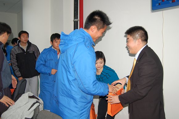冯军先生的的演讲得到了队员们的热烈欢迎,会后冯军先生还向足球队每位成员赠送了一套“爱国者国际象棋”,希望大家在比赛、训练之余,通过下棋来放松心情,体会“六赢”理念和团队精神的精髓。冯先生向每个队员表示:华旗公司将永远向你们敞开大门,欢迎队员们在毕业之后加入华旗公司和“爱国者”团队。