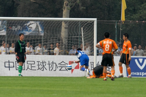 也许是轻敌的缘故,广州医药队一上来踢得有些漫不经心。而学生军面对劲敌丝毫没有放弃,大家都鼓足了劲奋力一搏。比赛前20分钟双方各有破门机会,广药并没能在学生军身上占到便宜。相反,爱国者大学生队频频通过反击威胁广药的防线,第26分钟,韩国留学生金俊植左路带球狂奔10余米后大力抽射,球稍微高出广药大门。第29分钟,爱国者大学生队队长袁微被广州医药外援撞伤,一分钟后他再次被踢中,受伤不轻,被担架抬出场外后才再次回到场上。