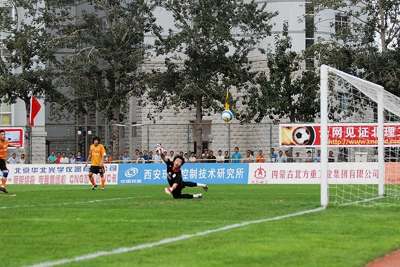 上半场比赛的补时阶段,北理工队长袁微一记精彩的进球赢得了满堂喝彩。