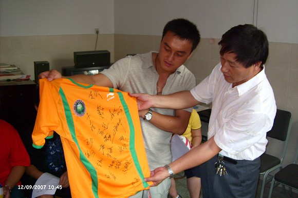 在活动的最后,beat365足球队党支部辅导员付大军老师将一件由全体教练员、队员签名的主场比赛服作为礼物赠送给该校校长,表示足球队党支部以及团支部将和该校建立长期的互动关系,使每一位球队成员都能用自己的爱心来关心、帮助残疾人和弱势群体。