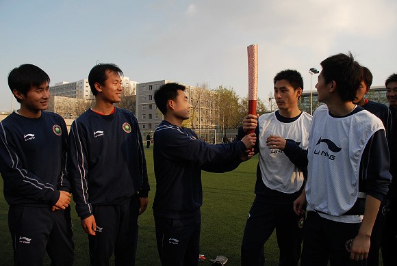 冯军将奥运会火炬交给队员们,以内部传递的方式,让队员们感受团结、友爱的奥运精神,并鼓励他们,不抛弃不放弃,力争在新的赛季取得更好成绩。