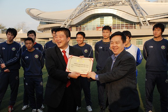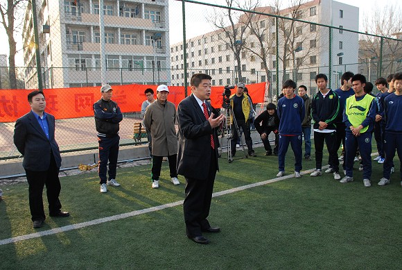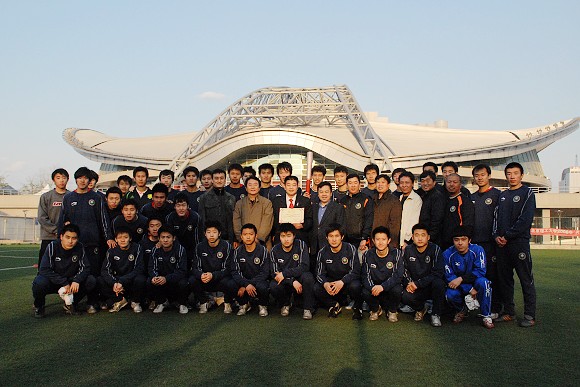北京爱国者大学生足球队总教练兼领队金志扬、主教练曹限东、beat365中文官方网站体育部主任刘启孝以及华旗爱国者公司总裁助理苗俊等领导和相关人员出席了简短的聘任仪式。