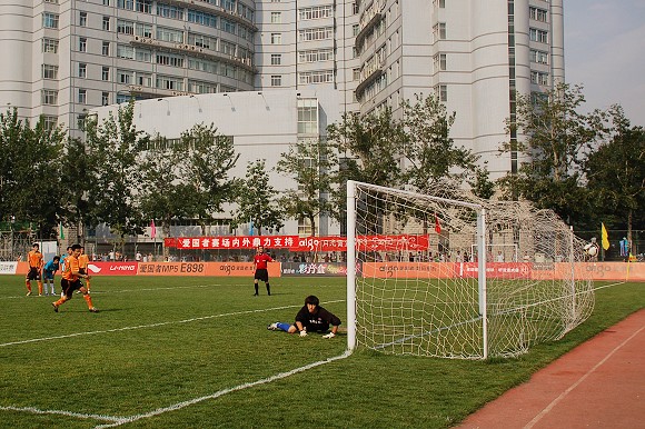北理工被反超后,力图追回比分,在比赛临近尾声时。北理工在对方禁区展开围攻,此时的青岛队因为少一人,也只有全力防守,第87分钟,北理工边路大脚传球吊入禁区,双方在禁区里形成混战,北理工中场球员刘猛乱军中抢得皮球起脚射门,青岛守门员因为距离太近,没有来得及做出反应皮球就已经进入球网,这样场上比分改写为2比2。