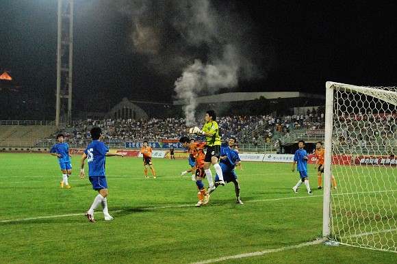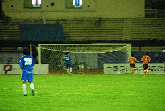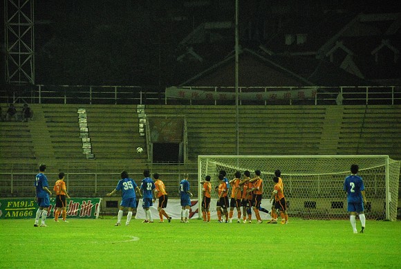 第18分钟北京理工在禁区弧附近犯规,九方队获得一个位置很好的任意球,霍顿主罚打飞.