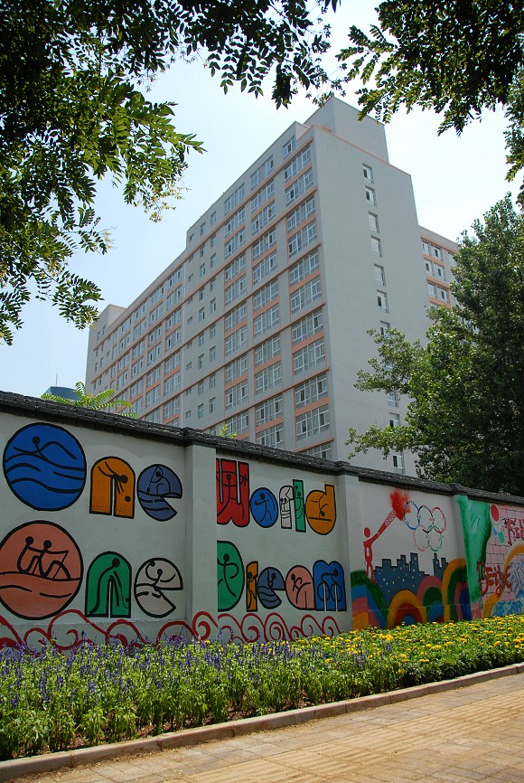 内容丰富、创意十足的奥运涂鸦与整洁的校园建筑交相辉映。