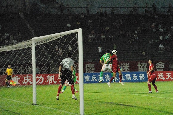第17分钟,重庆力帆在右边路起球传中到后点,还是王锴接应后回敲,胡伟的远射被门将扑出。外围的队友再起球传到前点,王锴包抄到位一个低空轰炸,漂亮的头球攻门被对方门将侧扑扑出底线。