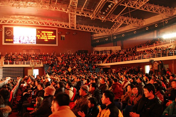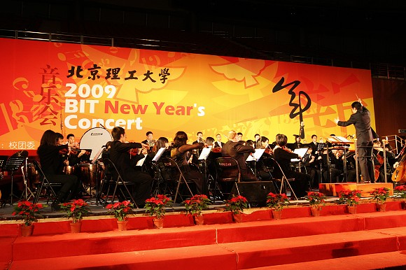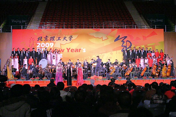 在回顾了历次新年音乐会的精彩花絮之后,2009年新年音乐会正式拉开了帷幕。由校大学生艺术团交响乐团带来的一曲节奏欢快的《北京喜讯到边寨》,在体育馆中营造了喜庆热烈的新年氛围。