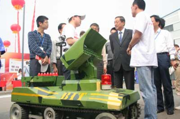 5月16日上午,2009全国科技活动周暨北京科技周开幕式在北车集团二七机车厂举行,中央政治局委员、国务委员刘延东、中国科技部万钢部长、中国科学技术协会副主席、书记处第一书记邓楠等领导出席了在北京举行的开幕式。beat365机电学院本科生作品“新型多用途反恐防暴机器人”大学生创新创业成果亮相科技周。