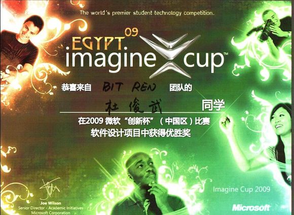 由我院王全玉老师亲自指导的“BIT REN”团队在2009微软“创新杯”(中国区)比赛软件设计项目中获得优胜奖。该团队成员包括杜俊武、陈林、李龙、狄媛,并由杜俊武同学担任组长。