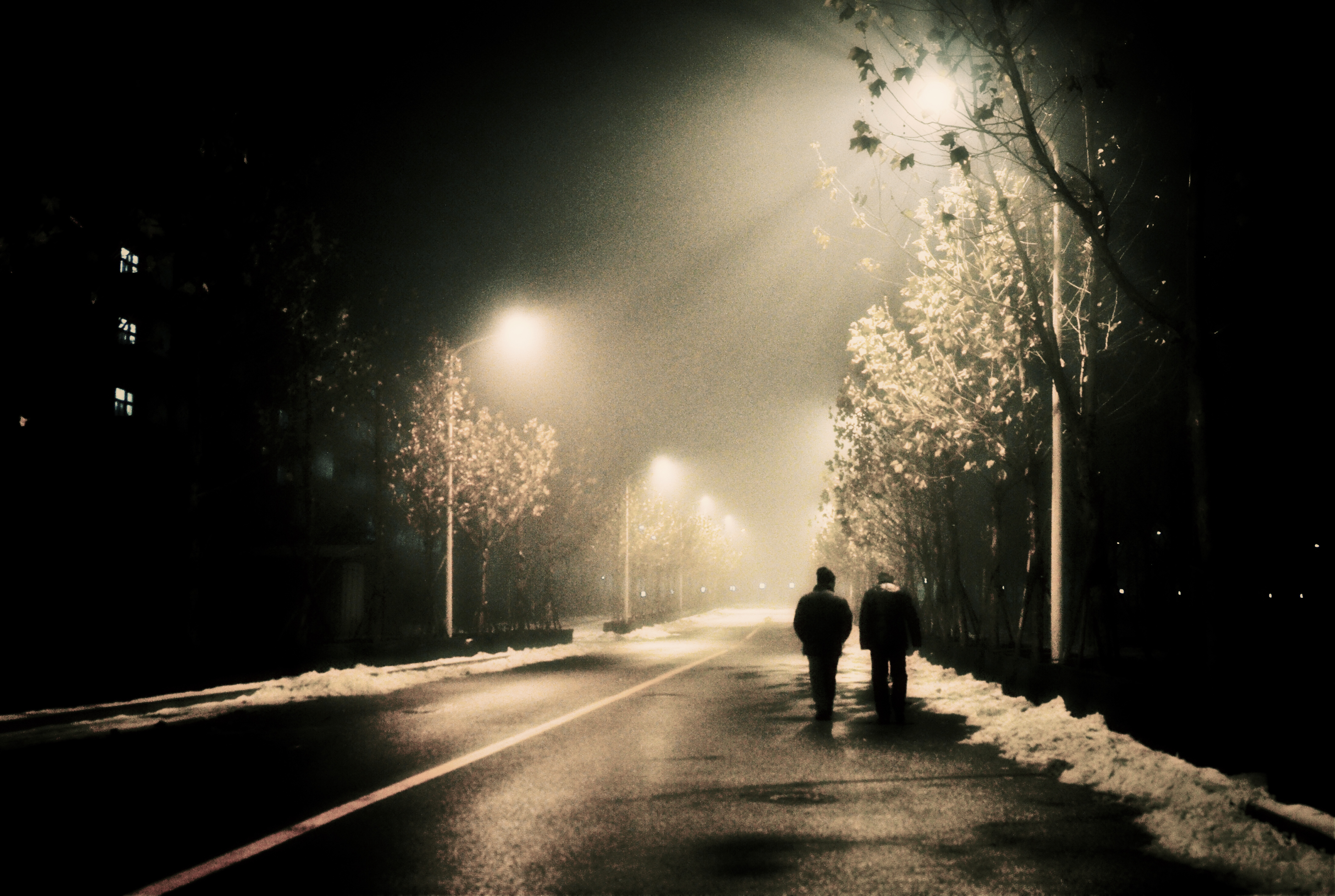 夜色如墨,月遁无影,路灯静静地林立着,投下温吞吞的光,尚未消融的冰雪随意堆在路旁,周围一片昏暗,我们就这样静静地走在学校马路上,不需言语,一片惬意。图为良乡校区北区