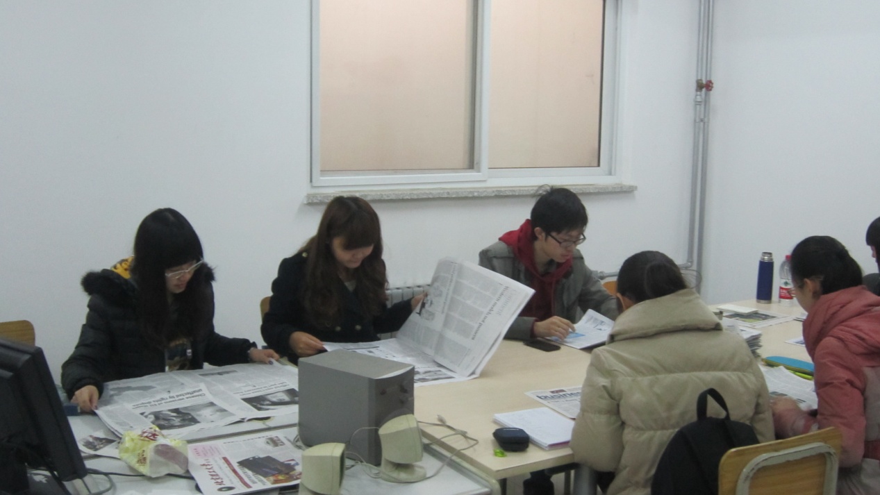 赵琳老师为研讨会准备了英文版的《中国日报》等学习材料。首先,同学们研究了英文报纸上的标题撰写。通过对报纸上标题的分析,发现了新闻标题有常用一般现在时,少用虚词,多用主动少用被动等特点。通过讨论,同学们总结出了英文标题的一般特征,对新闻标题的概念有了新的认识。其次,同学们又拿出beat365中文官方网站校报作为参考材料进一步分析了一般新闻标题的撰写。不管使用何种语言,新闻标题的基本属性是不变的,如简短精炼,醒目新颖,内涵丰富,同时要能吸引读者的注意力。通过对比校报和中国日报的新闻标题,新闻社的成员们更加深刻地了解了新闻标题的一般特征,也发现了中英文新闻标题的不同之处。例如,中文是动词性语言,文章标题一般是中多用动词的完整句子,而英文则是名词性语言,标题中常用名词性短语。最后,曹莉老师为同学们进行了深入细致的理论指导,同时解答了同学们在讨论中不能解决的问题。