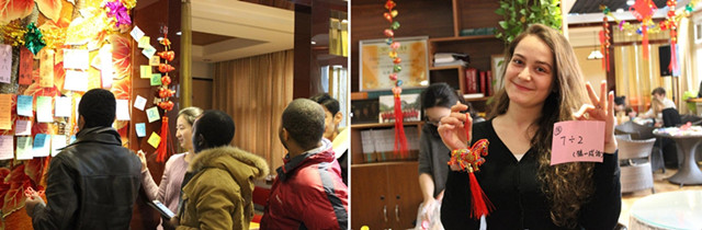 猜灯谜游戏吸引了不少同学的眼球,来自世界各国的学生们第一次见识了中国传统灯谜,他们开动脑筋,积极参与到其中,也体味着中国的文化。猜中的学生自豪地向大家展示着谜底及得到的小礼物。