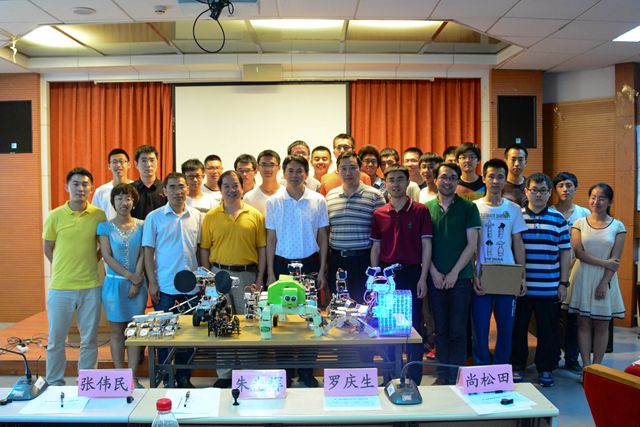 2015年5月,第十二届“世纪杯”学生课外学术科技作品竞赛在校举行。经过激烈的角逐,来自机器人创新基地的参赛作品——“自适应肌电语音混控灵巧手”斩获大赛的一等奖,创造了低年级学生问鼎“世纪杯”赛场的“奇迹”。面对传统机械臂“体积大、速度低、灵活性差”等技术难关,在指导老师罗庆生的帮助下,团队同学通过查阅资料、设计模型、实验分析、优化结构等方法创新性地提出了采用“在仿生灵巧手四指部分每个关节处安装一个独立控制驱动电机”的全新动力系统。优化后的机械手可实现四指的二维弯曲运动和拇指在空间任意点处的运动,突破了该领域的技术瓶颈并取得显著成效。