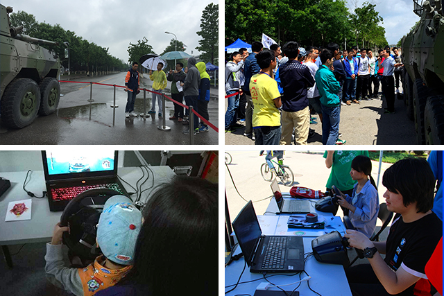 5月14日连绵不断的小阵雨让路面变得湿滑,各赛车团队出于安全考虑都只做以静态展示,但同学们对于“F1模拟驾驶挑战赛”、“装甲车探秘”两项体验活动的参与度有增无减。