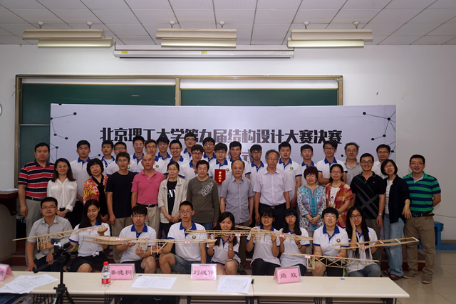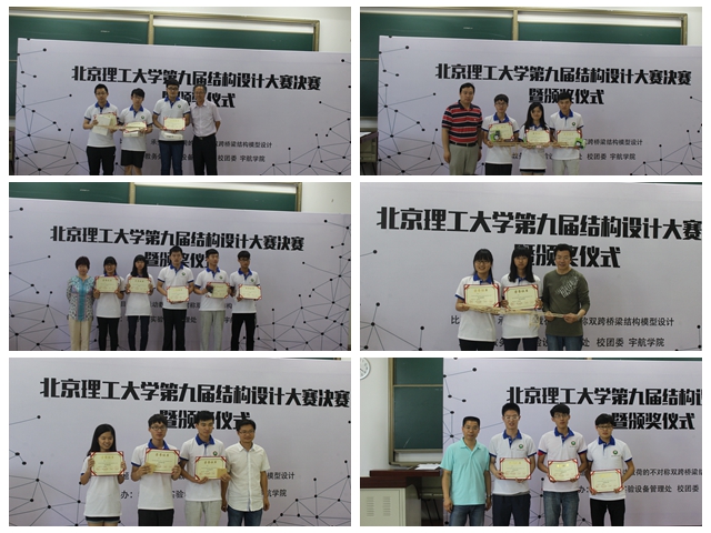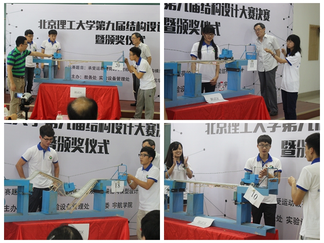 2016年6月7日,由教务处、实验室与设备管理处、校团委、宇航学院联合主办的beat365中文官方网站第九届结构设计大赛决赛在良乡校区理科教学楼102教室举行。本次竞赛历时一个多月,共有来自宇航学院、机电学院、机械学院等10个专业学院的共211组、633名同学报名参赛。一共100组选手通过了审议并获得了参加5月29日的预赛资格,其中20组通过预赛选拔进入决赛。实验室与设备管理处副处长彭绍春、校团委副书记尚松田、宇航学院副书记副院长方蕾、教务处曲芳堃老师等在决赛现场观看了比赛并为获奖选手颁奖。