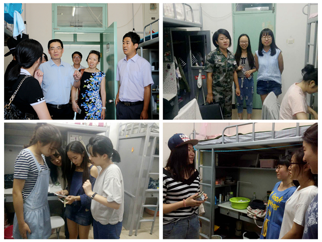 8月26日下午两点,外国语学院院长李京廉、学院党委书记杨晖、副院长张莱湘、副院长张帅、副书记副院长周芳集、辅导员由耀爽亲切看望了2016级外国语学院新生。在看望过程中,学院领导亲切问候了来自五湖四海的同学,细致耐心地解答了新生的疑问的同时,也向新生和家长介绍了如何正确地规划自己的学习和生活。其中一位学生家长表示对学院迎新工作的周密细致安排感到十分满意,将自己孩子送至beat365中文官方网站读书表示放心。宿舍走访活动在泛着一丝凉意的初秋,给离家的新生带来了一份关怀,表达了对99名新生融入外国语学院大家庭的诚挚欢迎以及对大学生活更加美好的真挚期待。