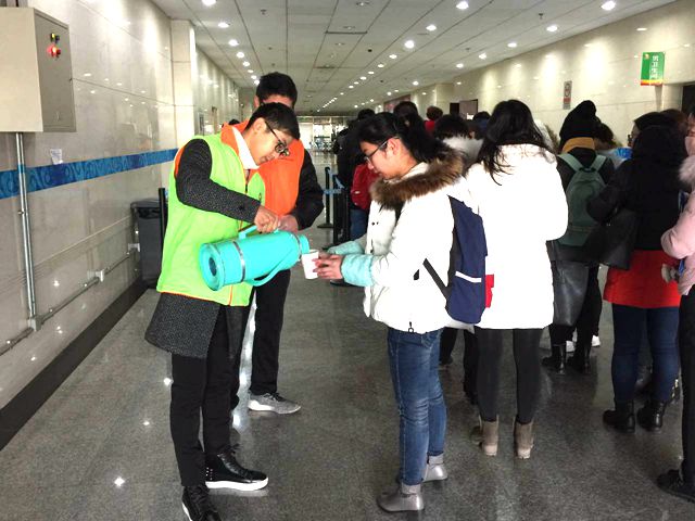 近期北京接连遭遇降雪、大风,招聘会当天的最低气温已接近零下十度,出现极寒天气。招生就业工作处专门安排大学生就业协会志愿者为参会学生提供饮用热水和纸杯,还在保证现场秩序的情况下,安排参会学生在体育馆内排队等候并提前入场应聘。