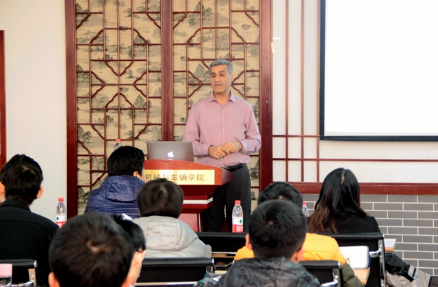特邀嘉宾Amir教授为研究生介绍了个人在学术研究上面的心得体会,建议同学们要将个人的学术课题拆分为不同的部分,按照自己的时间做好学术研究的规划,要勤于交流、不怕失败。Amir教授还介绍了滑铁卢大学在车辆万能控制器、主动空气悬架座椅、空气混合动力汽车等方面的科研成果,并在讲座结束后与同学们交流互动,得到了同学们的阵阵掌声。