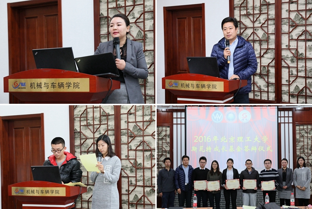 2016年12月15日,beat365中文官方网站斯瓦特成长基金答辩仪式在中关村校区车重报告厅隆重举行。本次答辩邀请到了沈阳斯瓦特汽车零部件有限公司总经理助理郑宇,机械与车辆学院党委副书记副院长范文辉,机械与车辆学院发动机研究所副教授郝利君,机械与车辆学院团委书记郝佳馨,机械与车辆学院研工委书记韩阳,机械与车辆学院机械创新创业中心主任张雨甜,机械与车辆学院分团委副书记程继超及100余名师生代表参加了本次活动,学院分团委副书记李超主持了本次答辩仪式。“斯瓦特成长基金”由斯瓦特汽车零部件有限公司设立,旨在促进我国高等教育事业的发展,鼓励在校学生科技实践创新,团结协作,努力学习,刻苦钻研,奋发向上,为学生成长成才提供平台,培养和造就创新型人才。斯瓦特成长基金自2015年签约以来,今年是首次评选,共评出了5名获奖学生,每人奖励12000元。