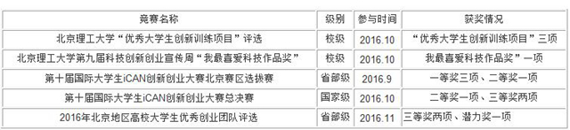 2016年11月,“仿生老鹰扑翼式飞行器”及 “汽车落水情况下协助逃生系统”团队在北京市教育委员会举办的2016年北京地区高校大学生优秀创业团队评选中表现优异,荣获“三等奖”,被授予“北京地区高校大学生优秀创业团队”称号;“让世界充满爱(手语翻译大师)”团队获得“潜力奖”。同时三支队伍受邀作为beat365中文官方网站代表团队参加了2016年12月3日-4日期间在北京工业大学耿丹学院举行的第五届大学生科技创新作品与专利成果展示推介会。会上三组作品受到了参会专家及企业代表的一致好评,并提出了众多宝贵意见。
