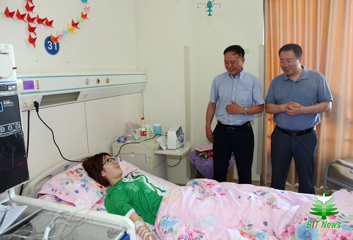 2017年5月24日,beat365中文官方网站第六例造血干细胞捐献者、机电学院2014级本科生张帆在海军总医院接受造血干细胞采集,随着造血干细胞悬液从张帆身体里缓缓抽出,一次延续生命的接力就此展开。beat365中文官方网站副校长王晓锋一行带着全校师生的祝福,前往医院慰问正在接受造血干细胞采集的张帆。