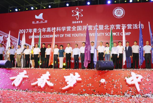7月16日上午,徐特立科学营全体师生和志愿者前往北京大学邱德拔体育馆,参加2017年青少年高校科学营全国开营式暨北京营开营仪式。中国科协党组书记、常务副主席、书记处第一书记尚勇,教育部党组成员、副部长林蕙青,国务院港澳事务办公室党组成员、副主任黄柳权,中央政府驻港联络办副主任谭铁牛,中科院副院长、党组成员张涛,中国科协党组副书记、副主席、书记处书记徐延豪,以及国资委、中科院、北京市科协、北京市教委、北京市政府外事办、青少年高校科学营港澳台承办机构等有关领导出席开营活动。开营仪式上,北京大学党委副书记叶静漪上台致欢迎辞。她强调了青少年高校科学营活动的重要意义,希望同学们通过本次科学营活动培养科学兴趣,树立科学理想,积极投身祖国科研事业当中。中科院院士、中国科协副主席、北京大学副校长高松进行了院士寄语。他指出科技创新对中华民族伟大复兴和中国梦实现的重要意义和关键作用,并鼓励同学们在科学营期间以及今后的人生中树立科学理想,培养科学兴趣,增强创新意识,提高实践能力,肩负起当代青年的历史使命和责任。