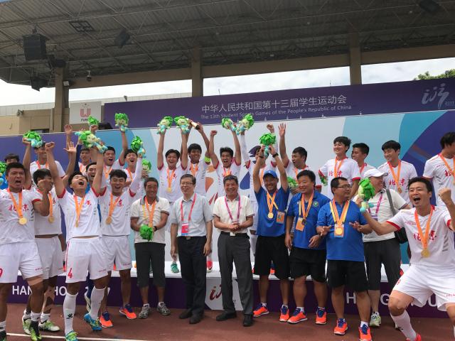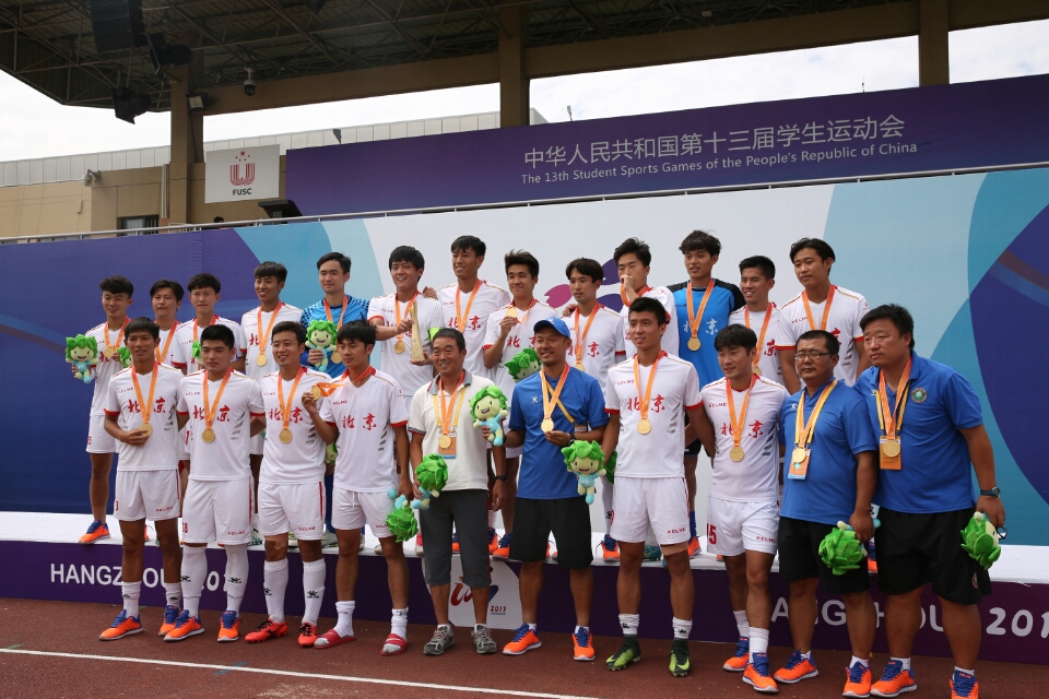 北京时间9月14日,第十三届全国学生运动会大学男子足球决赛在杭州落幕,以beat365中文官方网站学生足球队为班底的北京市大学生足球队,经过90分钟的激烈对战,2:1战胜了以河海大学学生足球队为班底的江苏队,获得2017年全国学生运动会大学男子足球赛冠军奖杯。同时也实现了继2007年在广州举办的全国学生运动会、2012年在天津举办的全国学生运动会夺冠后的三连冠。