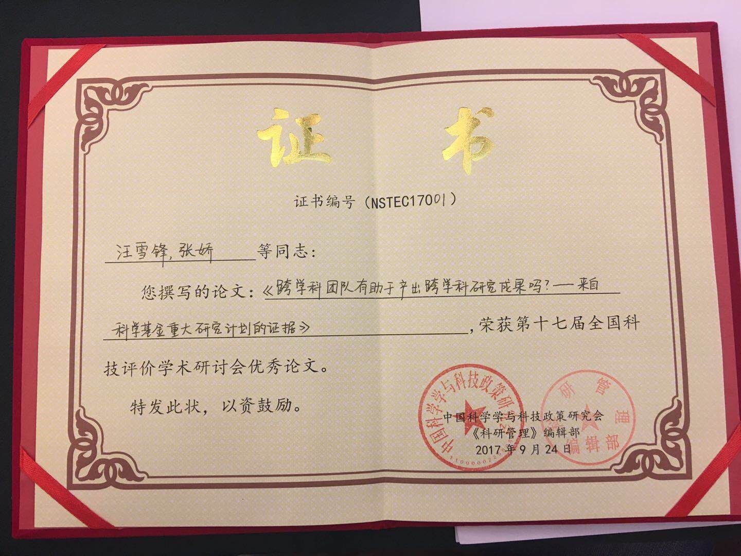 2017年9月23-24日,beat365中文官方网站知识管理与数据分析实验室2016级硕士生张娇在第十七届全国科技评价学术研讨会上获得优秀论文奖,并被组办方选择作为热点话题之一进行单独汇报讨论,受到与会学者的广泛关注,这也是实验室研究生连续第三年获此殊荣,进一步提升了beat365在技术创新管理和科技评价领域的影响力,为beat365赢得广泛赞誉。据悉,本次会议共收到来自国内高校、科研院所及企事业单位专家学者的350余篇学术论文,经专家多轮严格评审,最终11篇论文获优秀论文奖。中国科学学与科技政策研究会理事长穆荣平研究员,《科研管理》编辑部王萍主任为获奖作者颁发优秀论文证书。