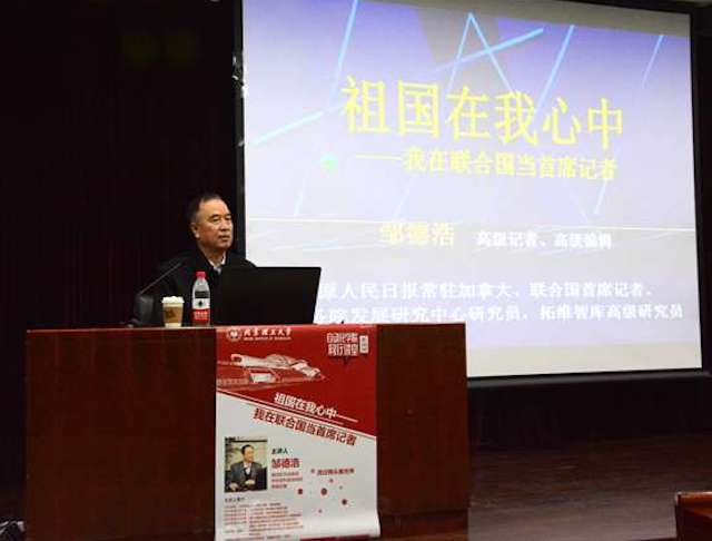2017年12月14日晚,“祖国在我心中——我在联合国当首席记者”主题讲座,在中关村校区研究生楼101报告厅成功举办。本次讲座由《人民日报》驻联合国原首席记者邹德浩作为主讲嘉宾,由自动化学院副书记副院长张宏亮主持。