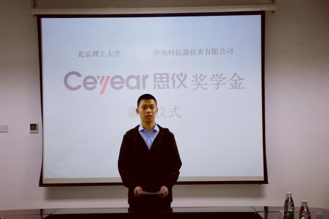 颁奖会上,获奖学生代表李帅上台发言,他从自身取得的成绩出发,表达了对学校、学院以及中电科仪器仪表有限公司的感谢,同时也表达了作为一名国防生投身祖国和部队建设的理想与决心。