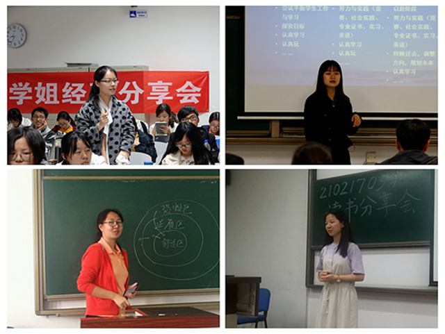 博览前人经验路,他山之石可攻玉。为加快2017级本科生成长步伐,发挥朋辈互助精神,引导学生学会从书籍中探寻成长方向,学院针对本次德育开题特组织开展“毕业年级学长学姐领航”系列活动以及“共读一本书”系列活动——《让毕业后的你,感谢现在的自己》。在“毕业年级学长学姐领航”活动中,学院优秀毕业生徐一婕、何鹏、金洁莹、王靖怡、段俣,高乃奇、曹正泽分别从保研、考研、出国、就业四个方面分享自己的成长故事和大学感悟,并希望学弟学妹们能够“以梦为马,不负韶华”,成就一段绚丽多彩的大学生活。在共读一本书活动中,各班同学分别选择书中自己感兴趣的一个章节进行阅读,并召开主题班会进行分享。在分享过程中,学生纷纷表示要走出大学“舒适区”,挑战自我,提升自身薄弱项,成就更好的未来。