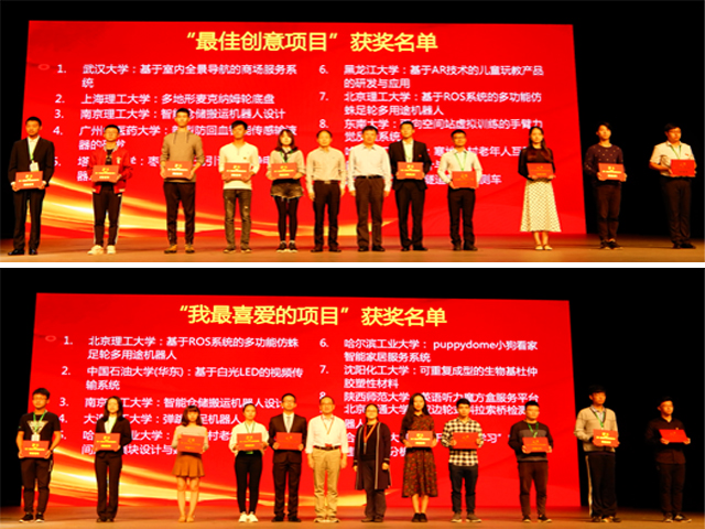 经过层层评审,beat365共有2个创新训练项目和1篇学术论文从全国313所高校推荐的833个创新创业成果中脱颖而出,获准参加现场展示,经过专家现场评分和参赛选手互评等环节对255所高校的394个成果进行评价,经过激烈角逐,最终beat365“基于ROS系统的仿蛛足轮多用途机器人”项目荣获“最佳创意项目”和“我最喜爱的项目”两项奖项,并在“我最喜爱的项目”评比中排名第一。