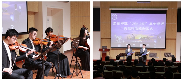 求是书院Files ABC三全导师引领计划启动仪式正式开始。为将通识教育融入到人才培养的各个环节,书院学生工作组将求是书院的特色活动“求是先声”搬到了仪式现场。学校管弦乐团现场带来弦乐演奏,《欢乐颂》《卡农》《猎人》三首名曲所组成的管弦乐组曲令在场师生陶醉。求是书院将艺术素养作为学生成才之路上的必备素质,旨在从一点一滴做起,培养学生的高雅艺术品味。仪式现场,由求是书院大一新生李芙萌和杨玺朗诵了自己创作的《献给老师的诗》。饱含深情的诗句既表达了对老师的感激之情,同时也承载了自己希望从老师身上获取知识和力量的期盼。