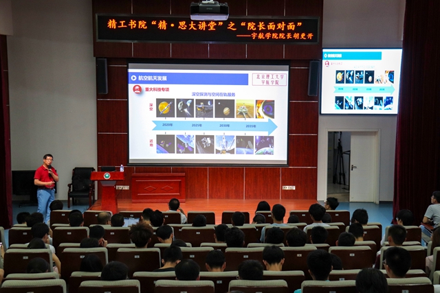 胡更开主要围绕航空航天发展、宇航学院基本概况、大学生活规划等内容展开。胡更开首先播放了宇航学院宣传片,对学院进行了总体介绍。接着以国家在航天方面的重大科技专项为切入点,引出宇航学院各专业研究方向,由点及面地向同学们介绍了飞行器设计与工程、飞行器动力工程、工程力学、航空航天工程、探测指导与控制技术和武器发射工程等六个本科专业的课程设置、教学理念、培养方案、办学特色等情况,帮助同学们对相关专业有了更加深入的了解。讲座最后,胡更开对于如何过好大学生活方面提出了几点期望:一是强调了建立目标的重要性,目标是指引我们前进的动力。二是有了目标就要付诸行动,敢于担当,敢于负责,善于团队合作。三是要学会感恩,感恩父母、老师、同学,感恩国家。最后,胡更开希望同学们要趁在学校学习阶段牢牢地夯实基础,主动学习,并好好地利用学校的资源来武装自己。