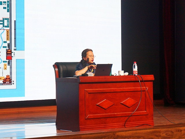 故宫是中华文化的重要象征,是传统文化的集大成者,蕴含了丰实深厚的中华优秀传统文化。任万平主要从事清代政治制度与礼俗研究,尤其对具有集大成特点的清代宫廷礼制与习俗有比较深入的思考。讲座中,她从紫禁城的概述、空间、历史人物和珍贵文物等四个方面详细介绍了故宫博物院,讲解了紫禁城、故宫和故宫博物院三种不同称呼所蕴含的含义。为了帮助同学们更全面的了解故宫,她引用历史图像学研究成果,以示意图的形式直观讲解了紫禁城的色彩、古建筑屋顶的种类以及彩画等知识点。她还向同学们展示了部分珍贵的书画作品、玉器、碑帖、雕塑等文物的照片,立体而形象地阐释宫廷礼制与习俗中蕴含的优秀传统文化精髓,以及我们今天应该如何传承与弘扬。