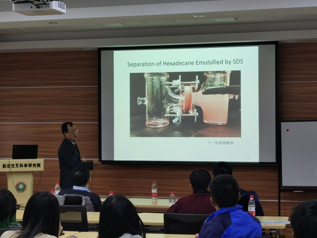 Guojun Liu教授首先介绍了防油和防水的超双疏涂料的制备。目前,超双疏涂料的制备通常涉及使用全氟化合物,但是现在许多国家都禁止使用全氟化合物,并且其涂层还缺乏耐磨性和光学清晰度,然而Guojun Liu教授课题组研发的一种超双疏NP-GLIDE透明涂料是在其基质中包含有纳米尺寸的超双疏区域,并且使用更加便宜环保的聚二甲基硅氧烷作为原料,其硬度可超过9H,耐钢棉磨损,同时具有透明性和柔韧性。Guojun Liu教授还介绍了通过简单过滤的方法分离乳化油和乙醇。传统的过滤分离方法很难将与水混溶的溶剂(例如乙醇)与水进行分离。然而Guojun Liu教授课题组通过Janus过滤膜的方法,实现乳化油与水的高通量分离。该过滤膜可以使乳化的油滴聚集,然后选择性地从水中分离出聚集的油相。基于同一原理,该滤膜可以通过过滤的方法从水中高效地分离乙醇。报告结束后,Luis M. Liz-Marzán教授与在场的师生进行了深入的讨论和热烈的交流。