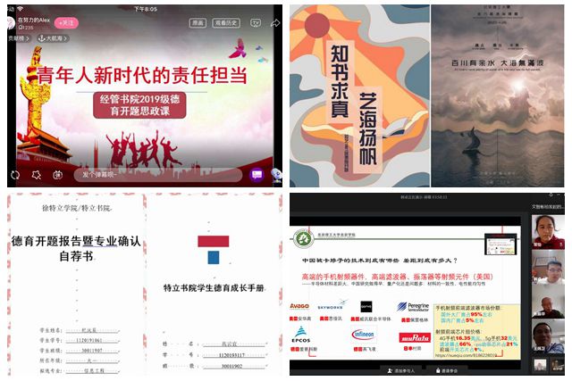 各书院坚持以习近平新时代中国特色社会主义思想为指导,以立德树人为根本,以理想信念教育为核心,以学生疫情防控期间所闻、所见、所思、所想为切入点,通过学生交流分享、教师点评指导、布置德育作业等多种手段开展各具特色的系列活动,教育引导学生以“大我”定位“小我”,以国家需要指引人生航向,切实激发求学报国的内生动力。精工书院通过与专业宣传月相结合等多种形式,鼓励学生探索自我价值、社会属性,结合爱国情怀和社会需要树立人生理想;睿信书院鼓励学生思考当下,畅想未来,确立人生坐标,撰写自己的未来“剧本”,做大学生活的导演;求是书院将北理工八十年的校史校情融入到求是书生的德育开题工作中,以史为鉴,助力学生成长成才;明德书院围绕“立德”二字,结合书院“礼、乐、射、御、书、数”的“六艺”培养体系,引导学生树立目标、认识自我、思考人生;经管书院通过开展“云端致远大讲堂”“云端经管有约”“云端辩论赛”“十年后的我”“云端共克时艰、历练成长”主题分享会等活动,启发和激励学生深入认识自我、探索未来发展方向;知艺书院通过接力添画的方式凝心聚力,结合自身思考,在线上共同完成一幅幅带有班级特色的画作;特立书院组织学生制定个人德育成长档案和班级海报,并以视频的方式记录下每位同学对自己大学四年的成长寄语;北京书院从责任担当、专业前景、能力训练、学习风气、学期总结及未来规划以及疫情期间感受等六方面引导同学们认真规划大学生活及未来发展。